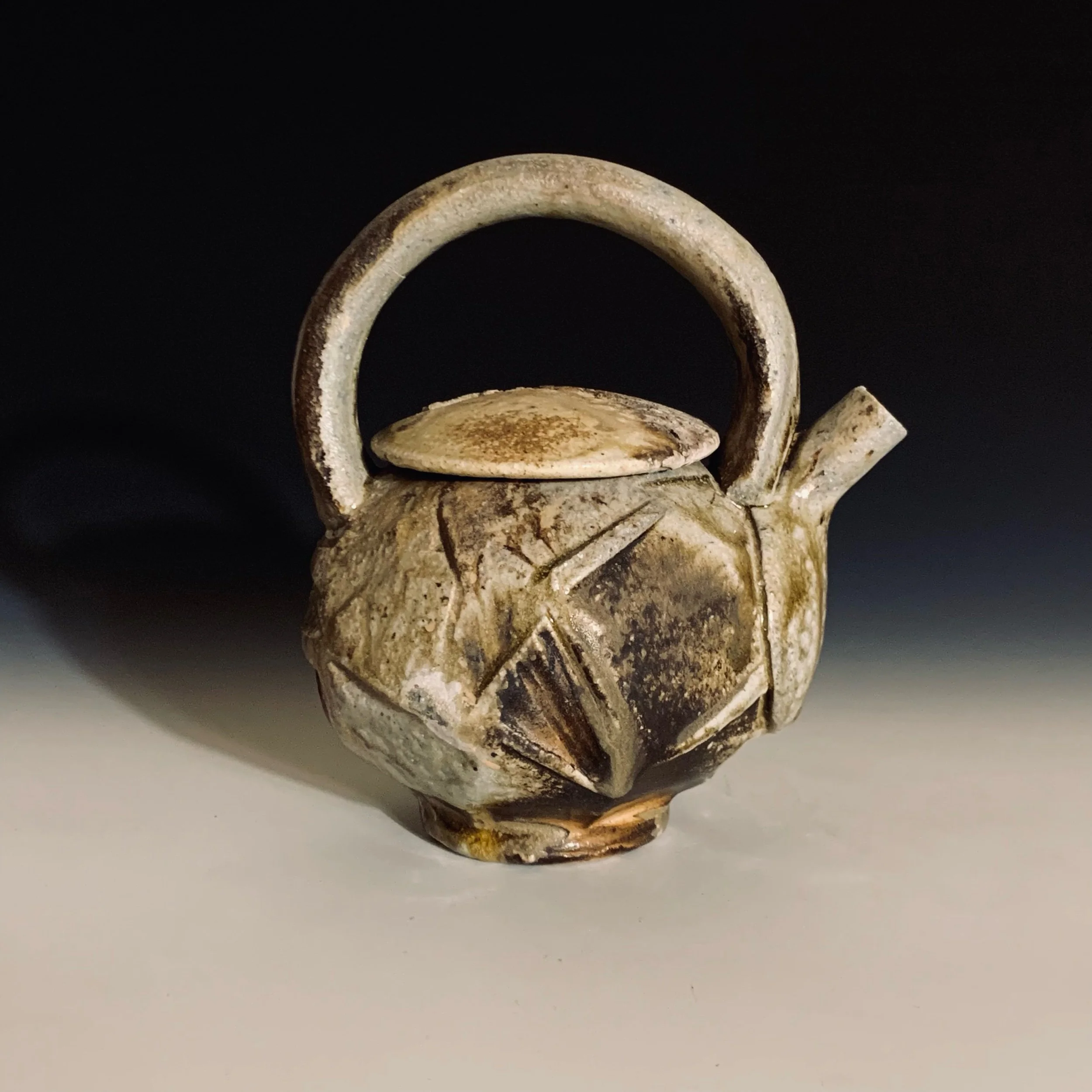 The lid on this pot is textured. It fell off the shelf into the coals in the kiln but miraculously survived. I find the story of the pot facinating.